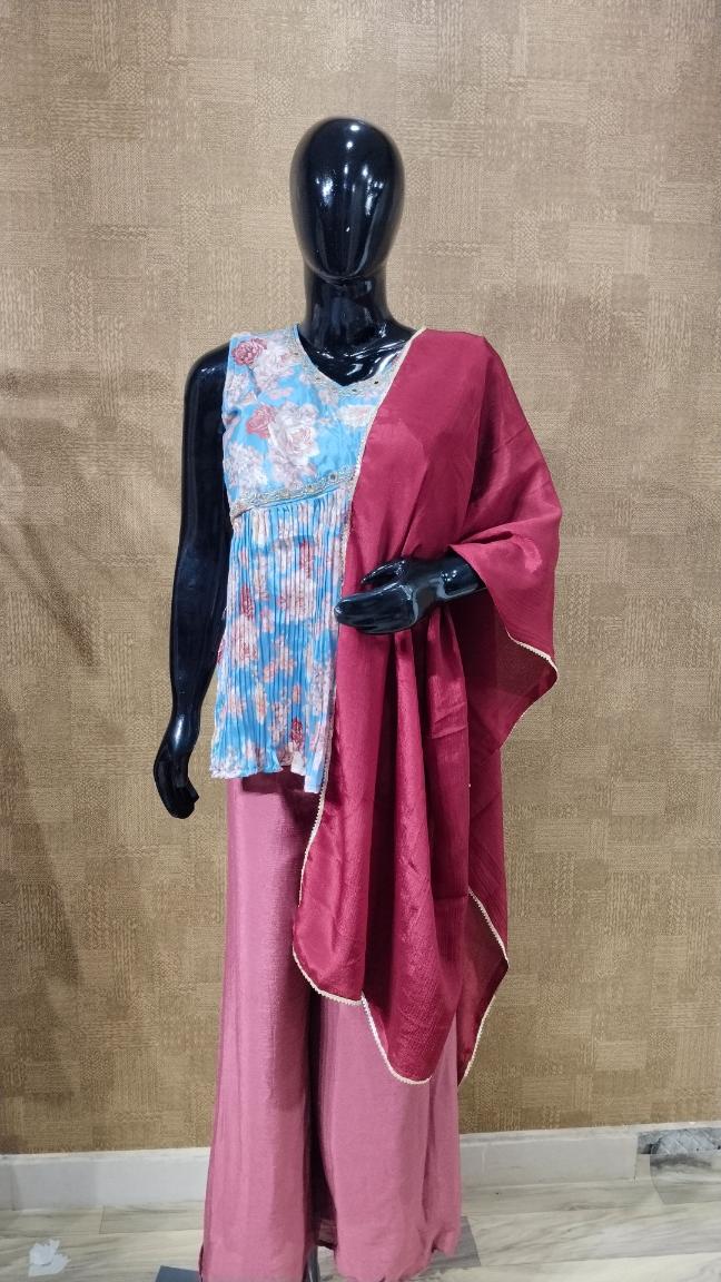 A charming threepiece ethnic ensemble in sky blue floral peplum top mauve palazzo pants and a matching maroon dupatta with gold trim for an elegant traditional look.