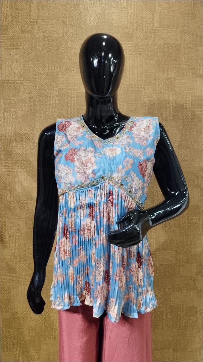 This charming ensemble includes a sky blue floral peplum top mauve palazzo pants and a matching maroon dupatta with gold trim. Its ideal for a vibrant festive and traditional look.